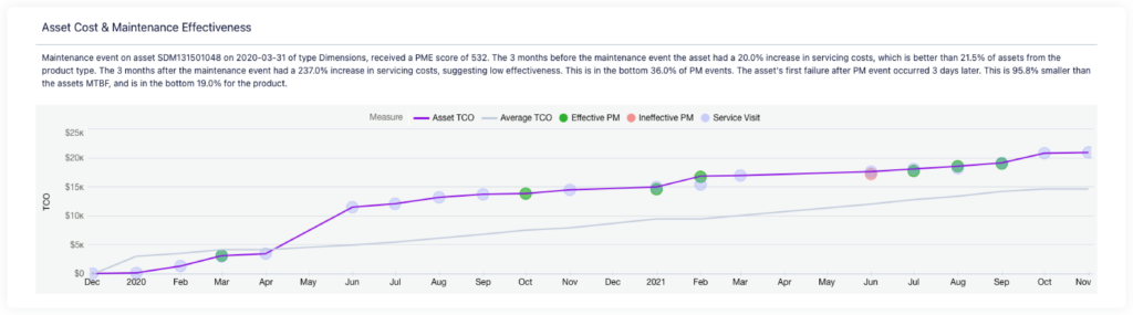 You are already familiar with the Asset TCO (Total Cost of Ownership) and Average TCO (based on the average TCO of the product type) trends. These trends have now been enriched with Service Visits and Preventative Maintenance events. Besides the trends themselves, you have the opportunity to understand which events had the greatest impact on your asset lifecycle, and which ones are missing.