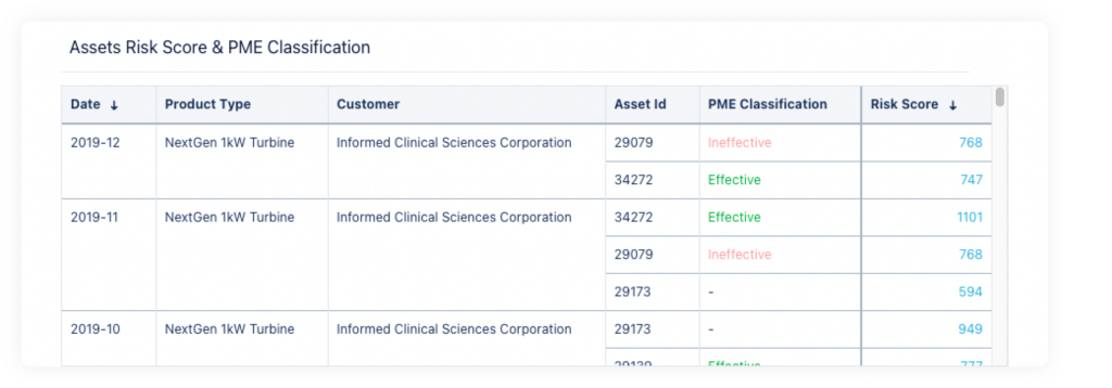 Alongside the Customer Risk Score, a new column “PME Classification” was added to give an overview of the maintenance events' effectiveness per asset, filtered by product type and customers.