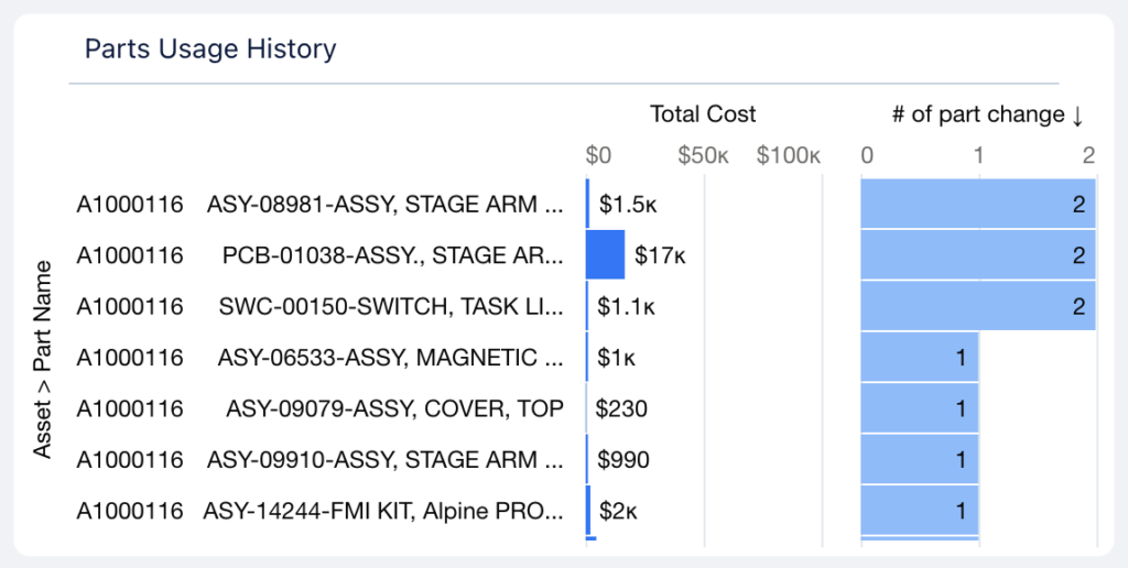 Because of this, we have updated the Parts usage history: the number of multiple part changes is now displayed in place of the latest part change. Alongside the cost, it provides you with actionable insights about the assets by emphasizing the most repaired assets.