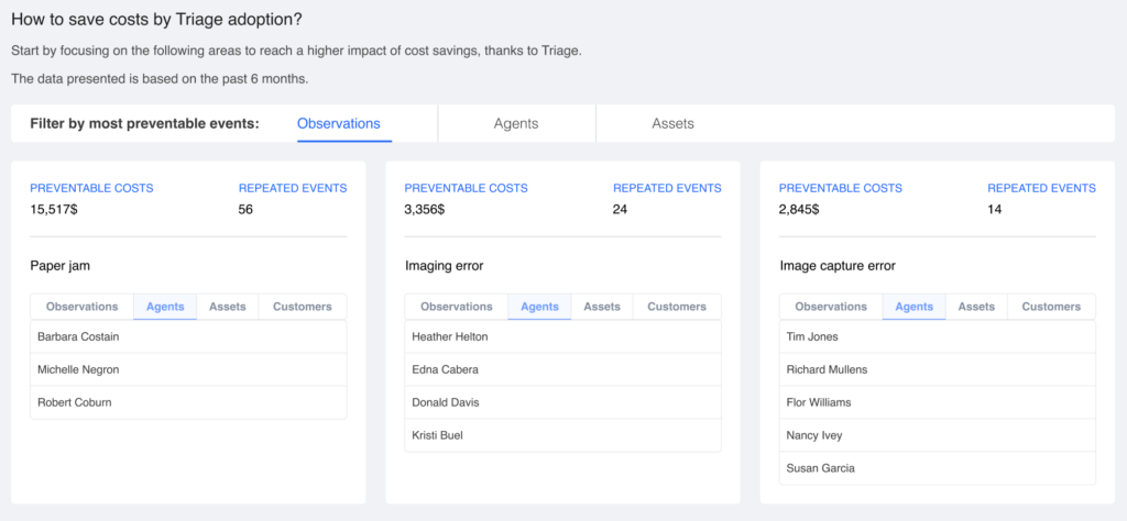 In this new version, we have enriched the page with a new Preventable-events analysis section. Our “what if” scenario goes further by analyzing service visits to understand how many could have been prevented if Triage solutions would have been implemented, as well as how much could have been saved.